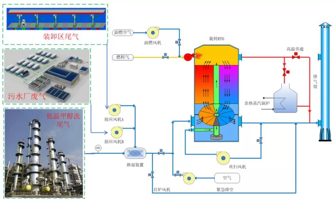 低溫甲醇洗廢氣具有風(fēng)量大、濃度高、近乎零含氧量,需要大量新風(fēng)或?qū)⑽鬯畯S生化池收集的VOCs廢氣、裝卸區(qū)和罐區(qū)排放VOCs廢氣參入稀釋后一同處理,實(shí)現(xiàn)整廠綜合治理。