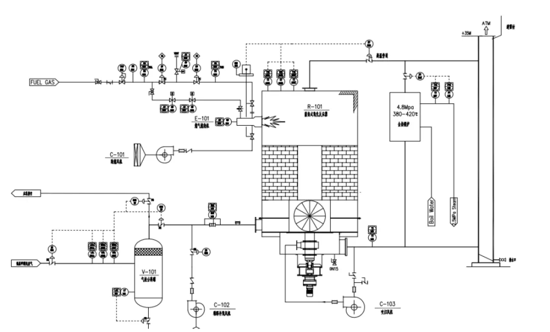 新疆廣匯新能源有限公司煤制液化氣采用Lurgi氣化爐,低溫甲醇洗廢氣量為56000Nm3/h,可燃組分濃度約4.6%,2019年新疆廣匯新能源投運(yùn)了一套5.6萬(wàn)方/小時(shí)處理量的TO直燃爐設(shè)備,配套50T/h余熱鍋爐,用來(lái)治理低溫甲醇洗廢氣。項(xiàng)目總投資8000萬(wàn),計(jì)劃每年的余熱利用效益1200萬(wàn)。因?yàn)門O直燃爐適合于濃度6%以上的廢氣,在低甲洗VOCs廢氣治理項(xiàng)目上使用能耗非常高,所以新疆廣匯低溫甲醇洗廢氣治理項(xiàng)目投運(yùn)后,每小時(shí)需要伴燒100—200Nm3/h天然氣,經(jīng)濟(jì)效益比預(yù)算大打折扣。